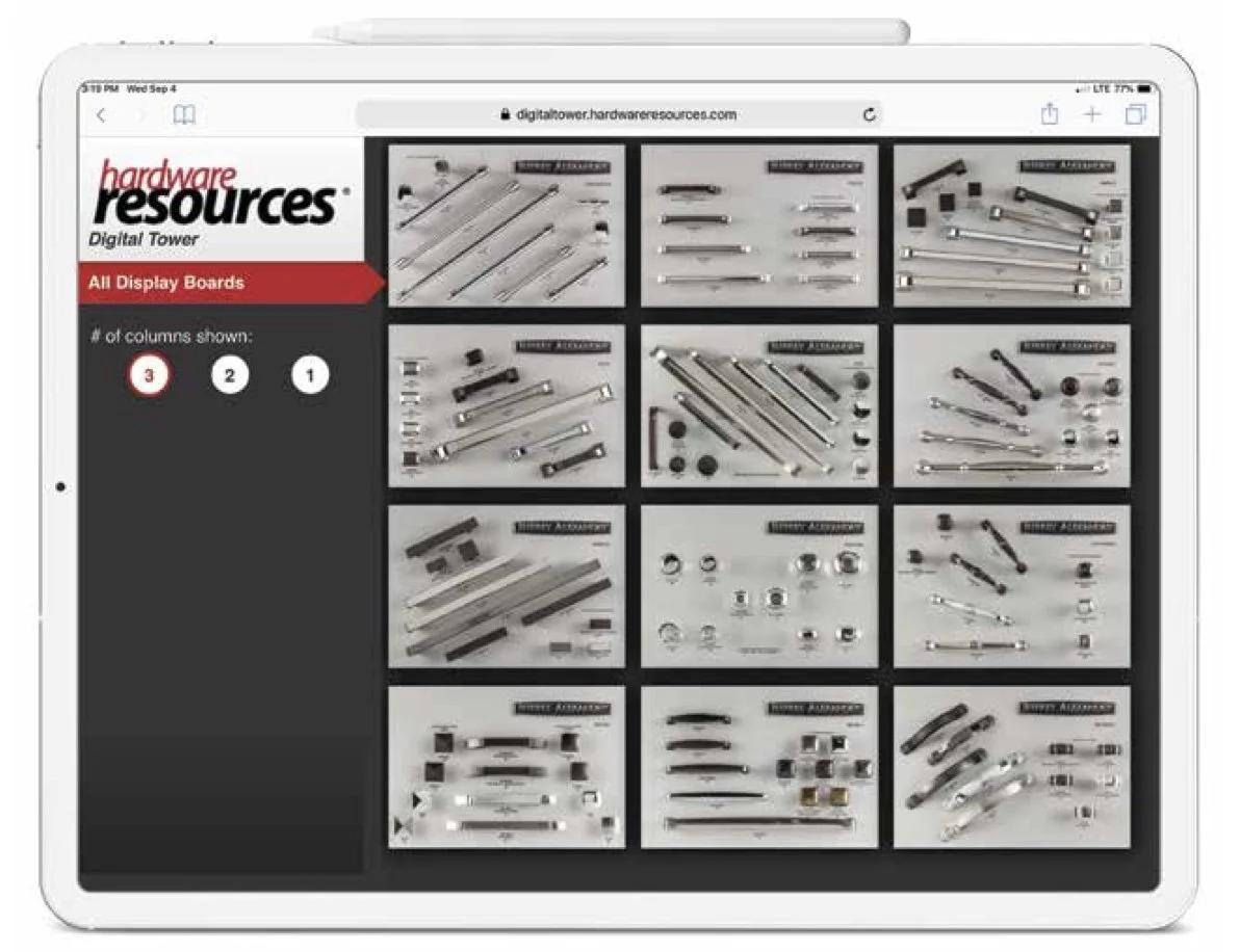 Sort by style, view large images of display boards, tap a knob or pull to view detailed product information and list pricing